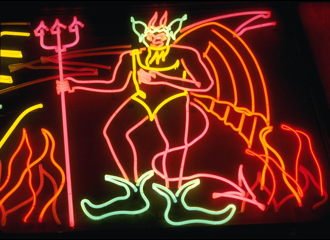 I photographed the neon devil on an American-style restaurant in Paris. Mounted above the entrance door, the five-color treatment of a devil in hell was delightful. The flames flickered and the wings flapped.